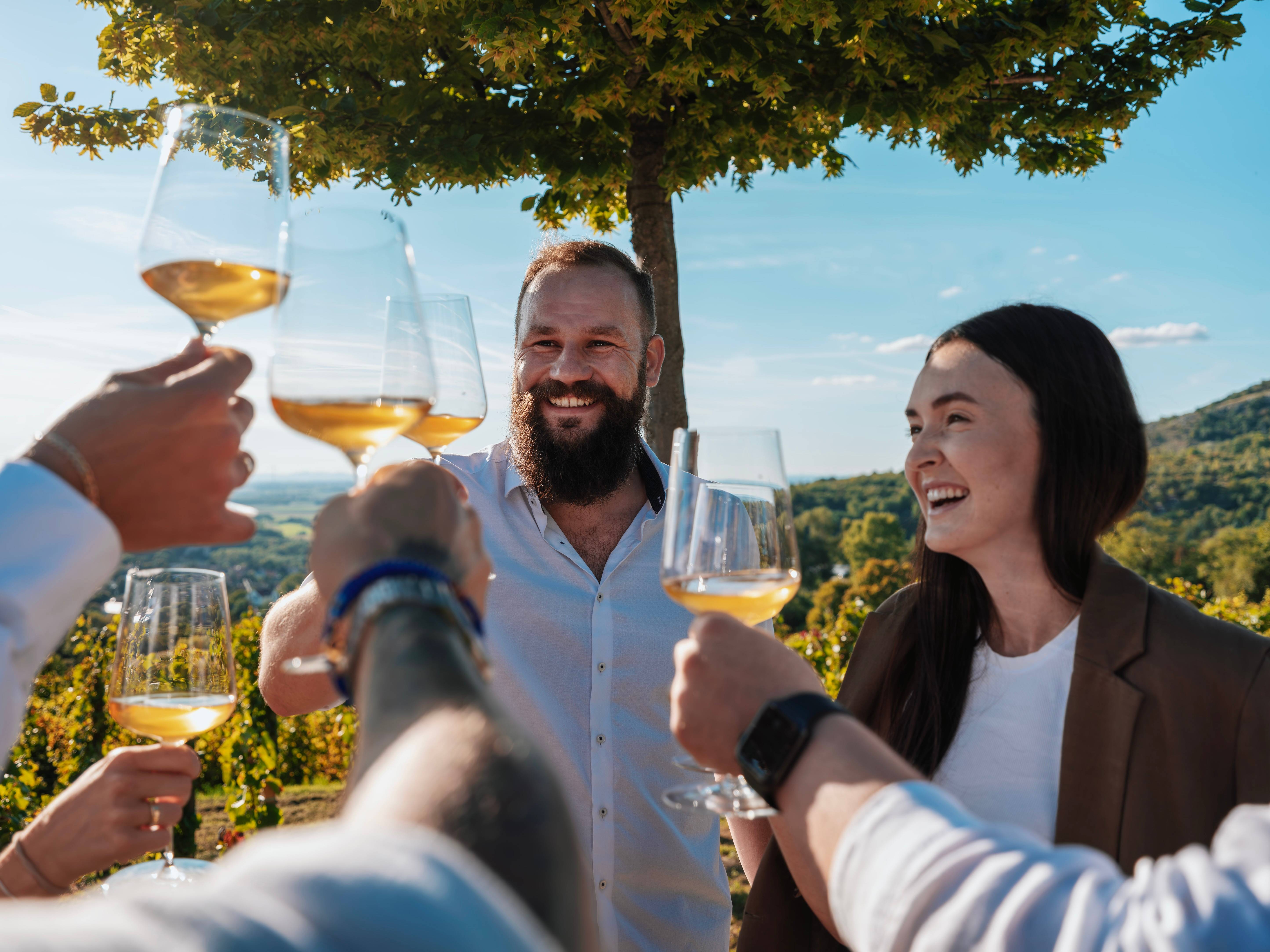 Zážitok si vychutnáte priamo pod vinohradníckou tratou Goldeck – pod holým nebom, medzi radmi viniča.